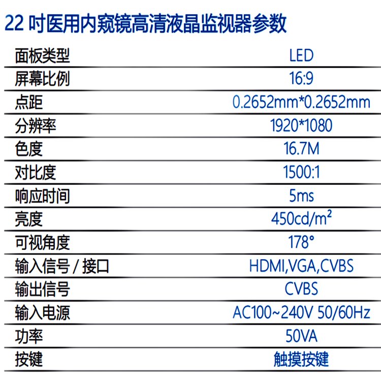 技术参数:面板类型:22TFTLCD显示尺寸:477mm(W)×268.5mm(H)显示比例:16: 9背光类型:WLED分辨率:1920*1080显示色彩:16.7M亮度:450cd/㎡对比度:1000: 1可视角度:178°/178°响应时间:5ms使用寿命:100000小时彩色制式:PAL/NTSC/SECAM菜单语言:简体中文、繁体中文、英文操作方式:按键输入输出接口D-15针RGB输
